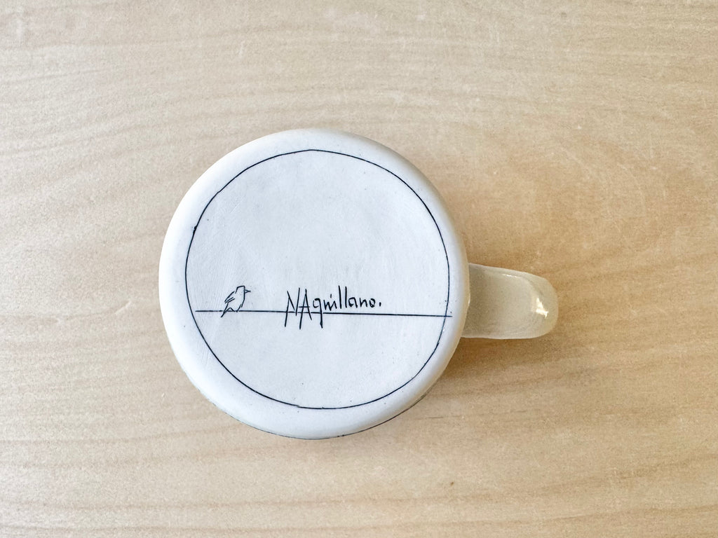 A one-of-a-kind mug inlaid with imagery. Ready-to-ship mug holds approximately 16 ounces and is microwave & dishwasher safe!