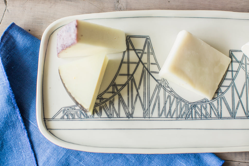 Each image is hand drawn directly into the porcelain clay with a knife, and the etching is inlaid with a dark underglaze. The high temperature of the kiln combined with a clear glaze overlay slightly blurs the drawing, much like a faded memory. Each piece is a one-of-a-kind work of art reminiscent of the places and experiences that define and connect us all.