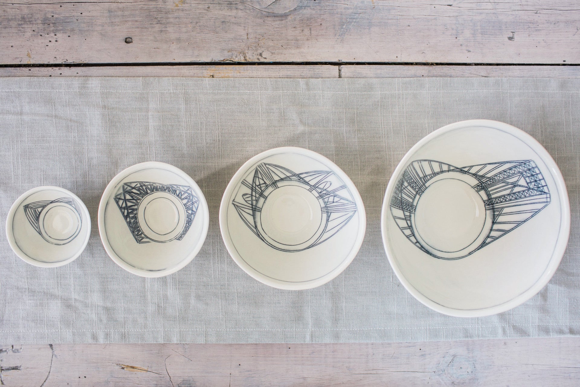 Choose your favorite images to create a collection of bowls reminiscent of your own personal narrative. Each image is hand drawn directly into the porcelain clay with a knife, and the etching is inlaid with a dark underglaze. The high temperature of the kiln combined with a clear glaze overlay slightly blurs the drawing, much like a faded memory. Each piece is a one-of-a-kind work of art reminiscent of the places and experiences that define and connect us all.