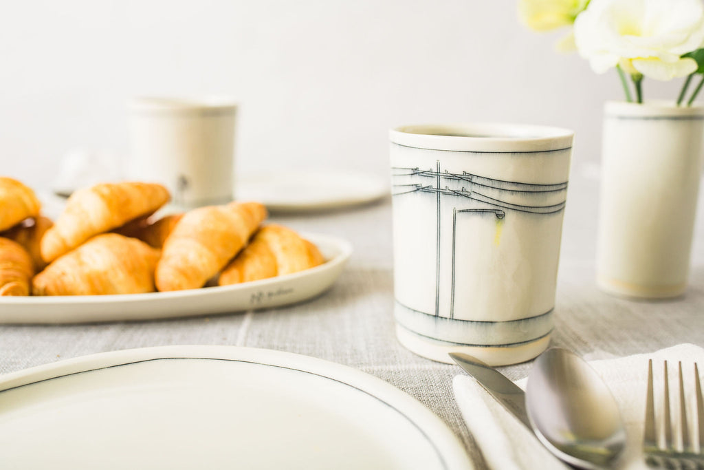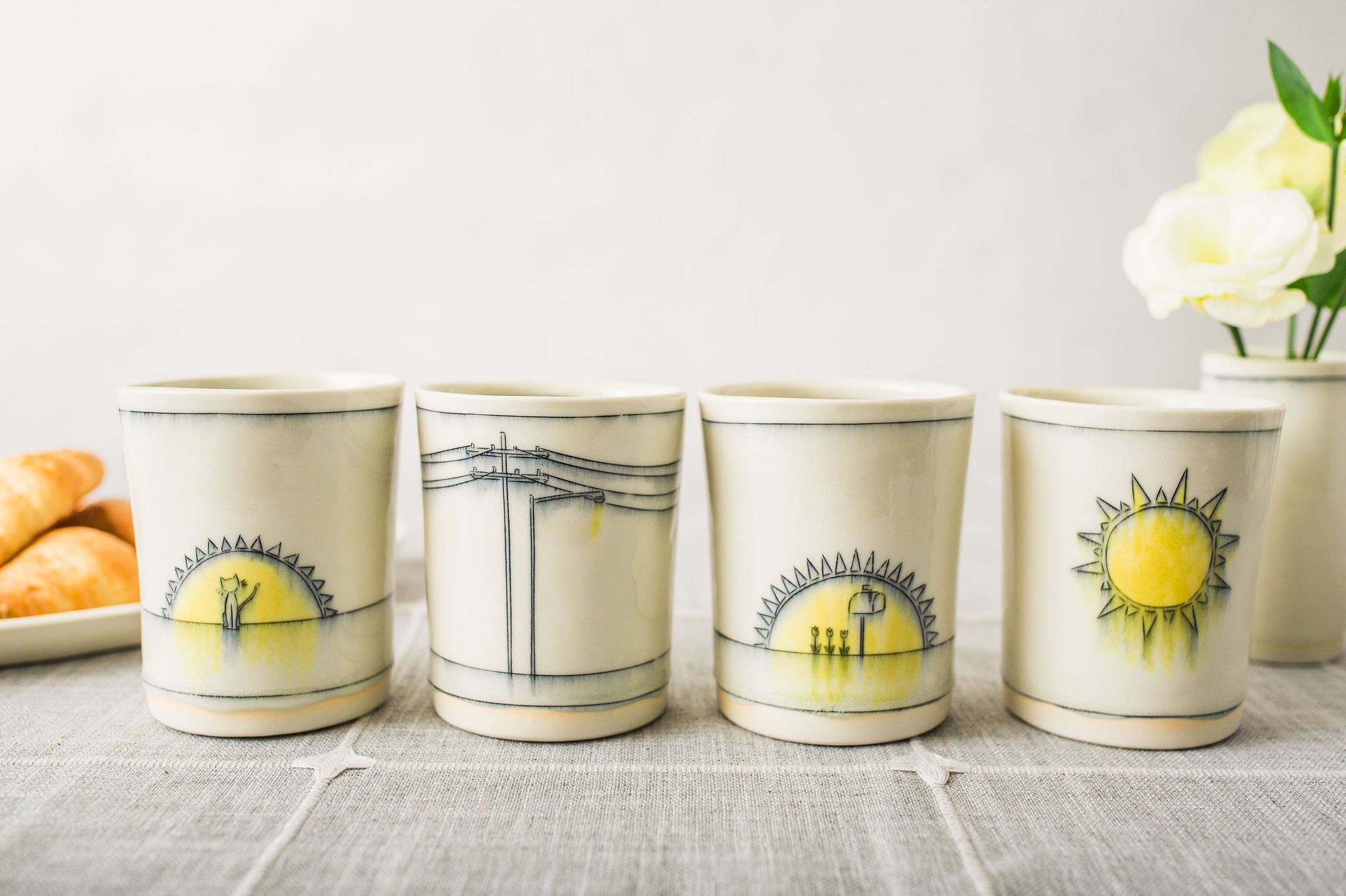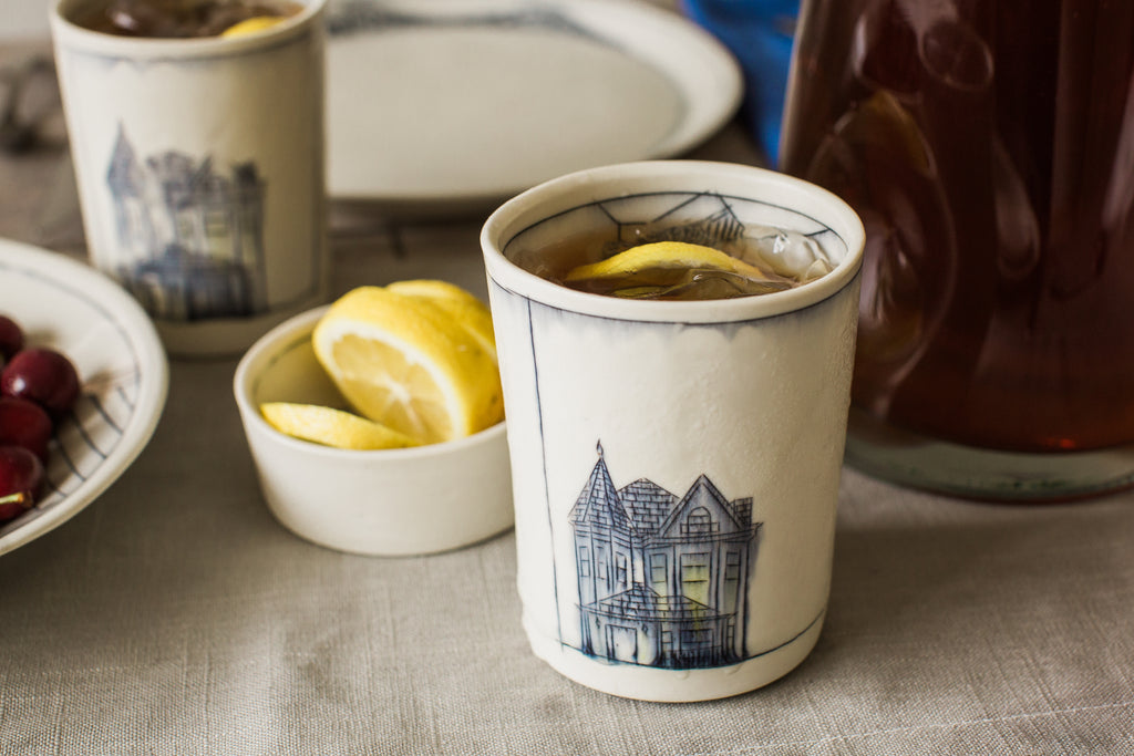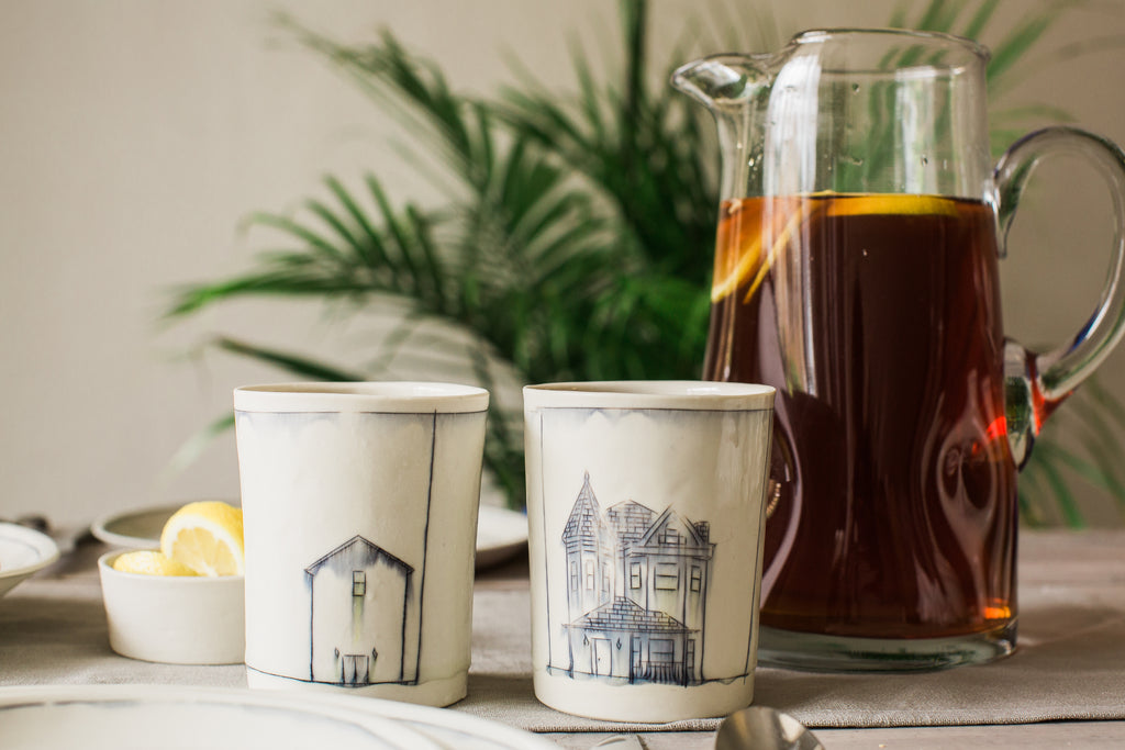 Choose your favorite images to create a collection of tumblers reminiscent of your own personal narrative! Each image is hand drawn directly into the porcelain clay with a knife, and the etching is inlaid with a dark underglaze. The high temperature of the kiln combined with a clear glaze overlay slightly blurs the drawing, much like a faded memory. Each piece is a one-of-a-kind work of art reminiscent of the places and experiences that define and connect us all.