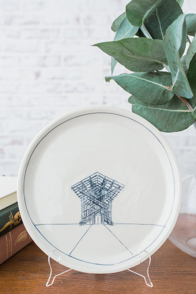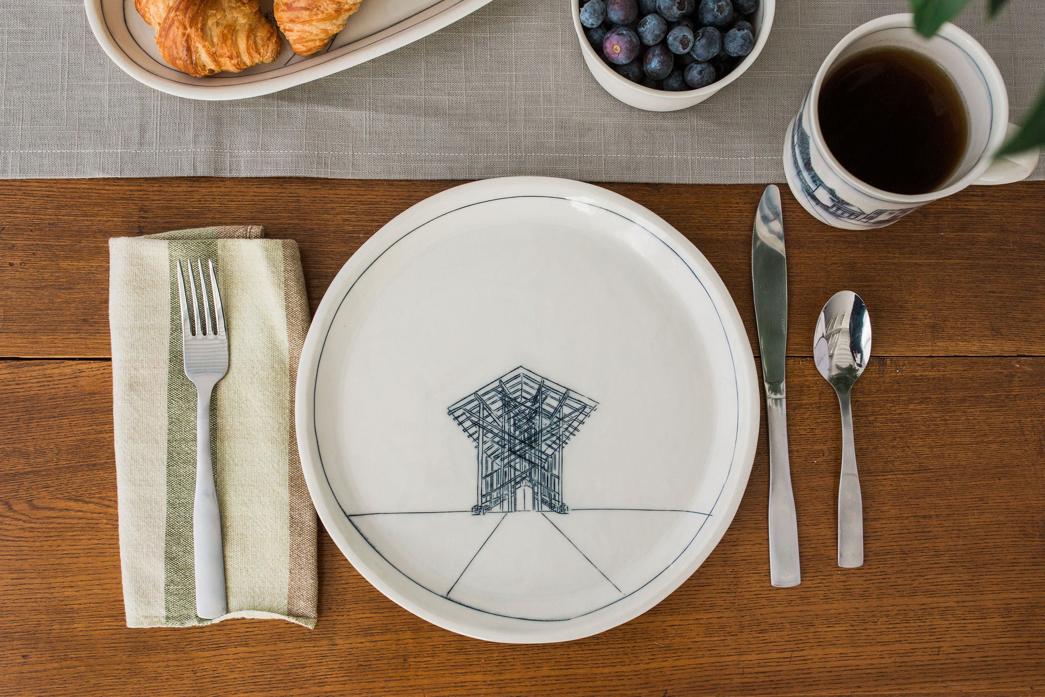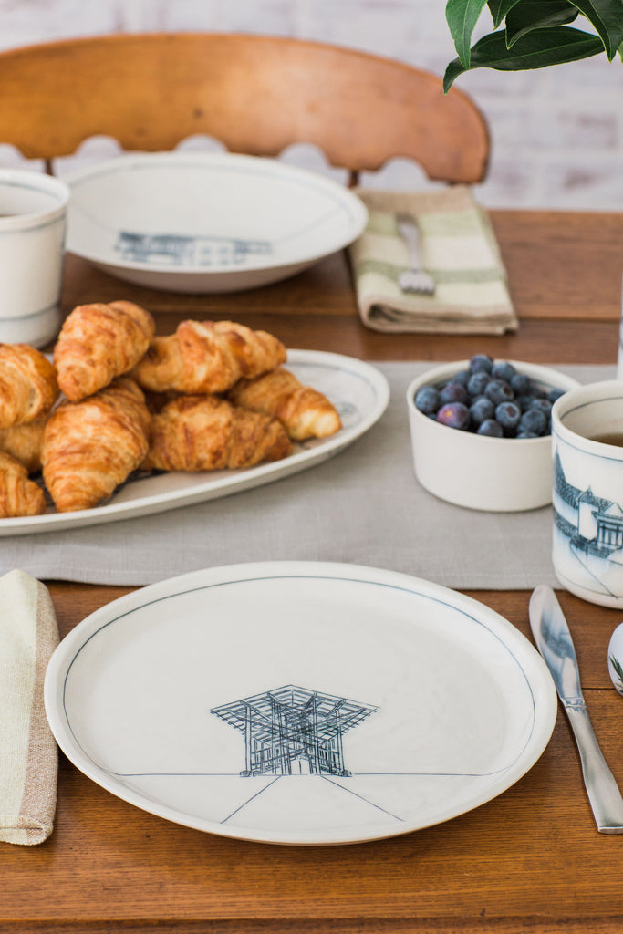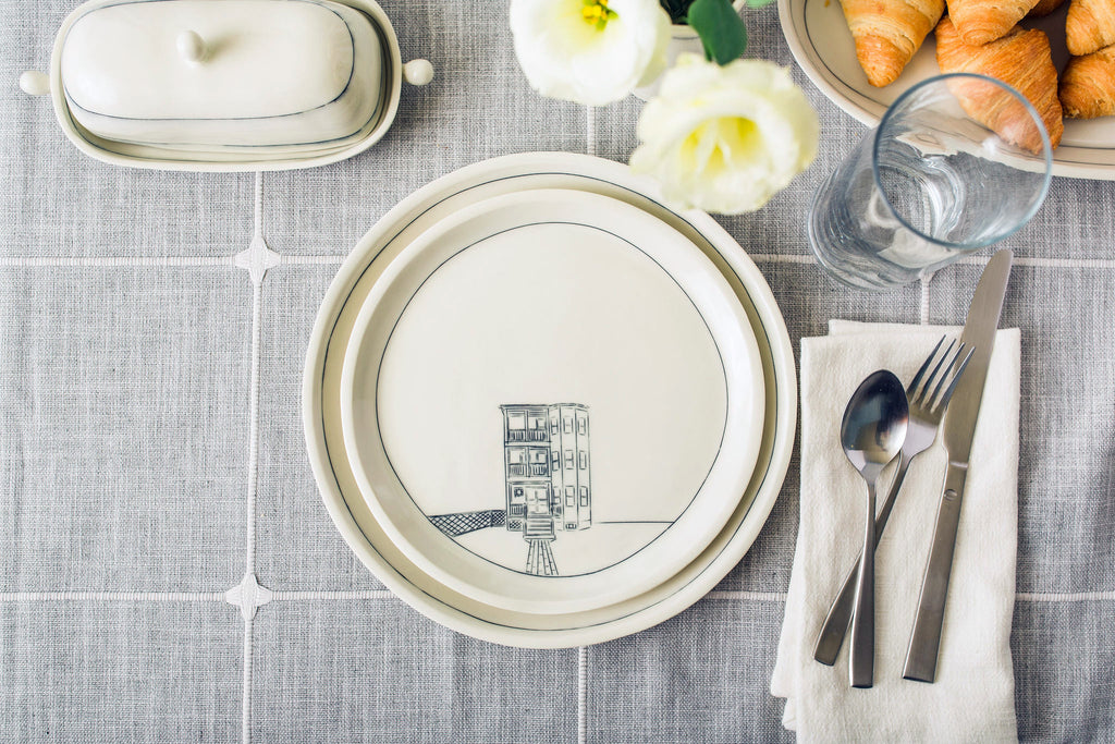 Saucer measures approximately 5.75 inches in diameter, dessert plate measures approximately 7.25 inches in diameter, lunch plate measures approximately 9 inches in diameter, and dinner plate measures approximately 10.25 inches in diameter. All plates are approximately 0.75 inches in height.