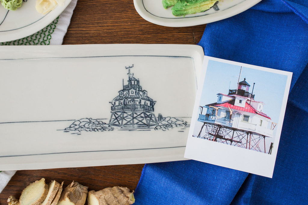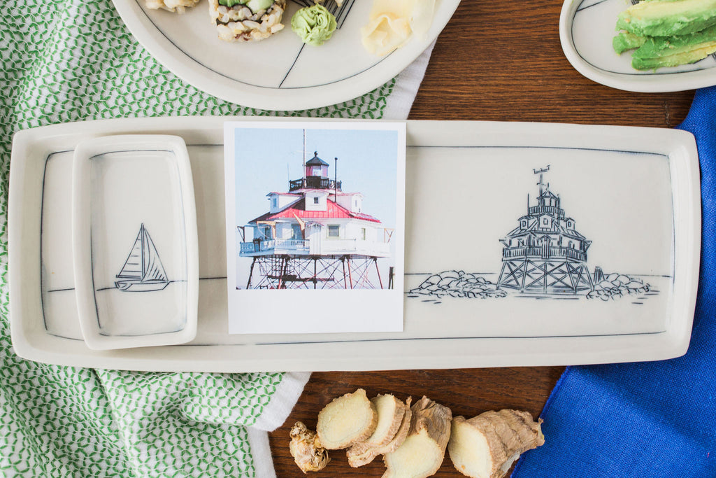 Sushi Set measures approximately 13.5 inches long by 5 inches wide and comes with a little dish that sits snugly inside. Or order a custom rectangular platter without the little dish if you'd prefer!