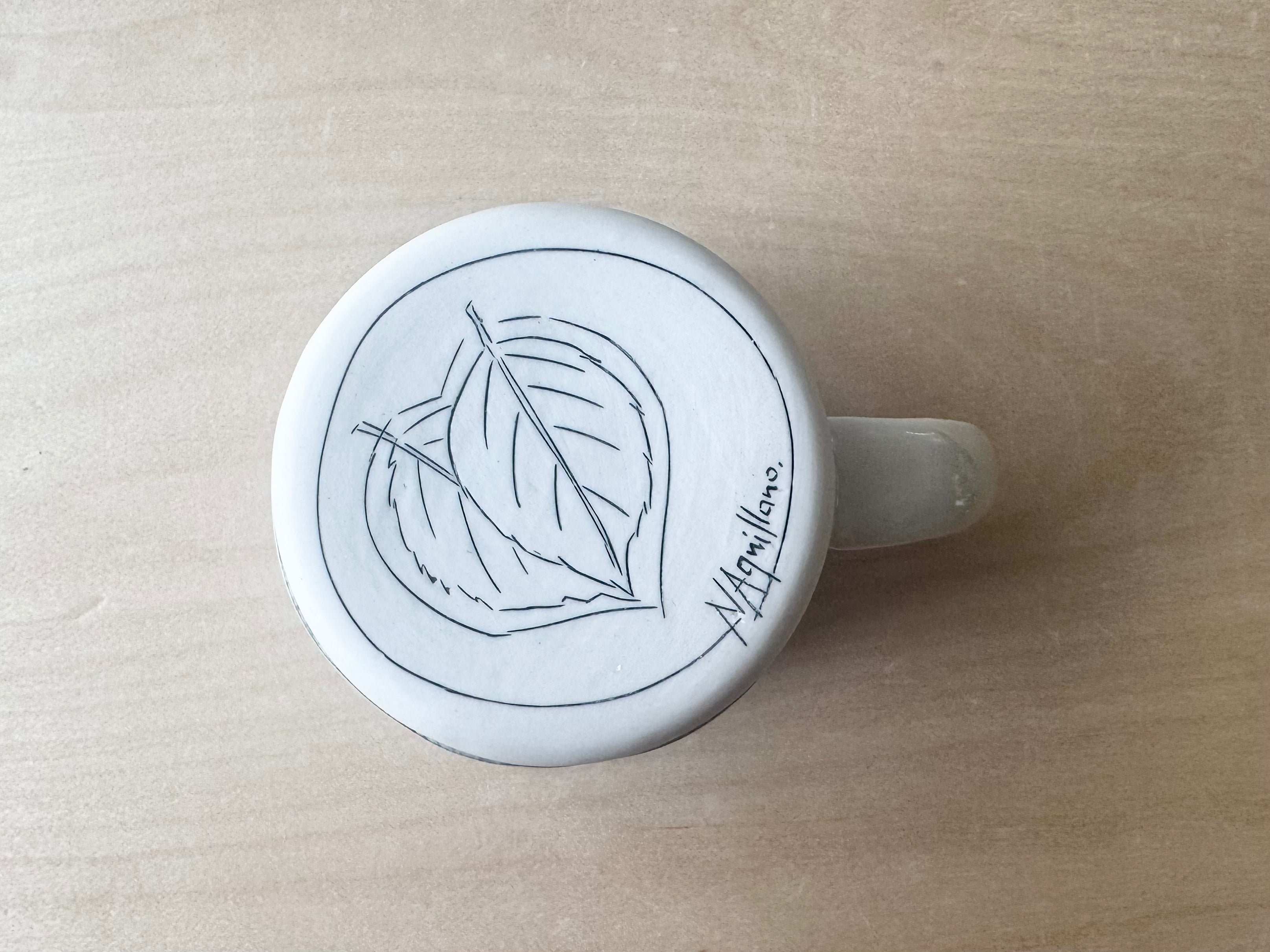 A one-of-a-kind mug inlaid with imagery. Ready-to-ship mug holds approximately 16 ounces and is microwave & dishwasher safe!