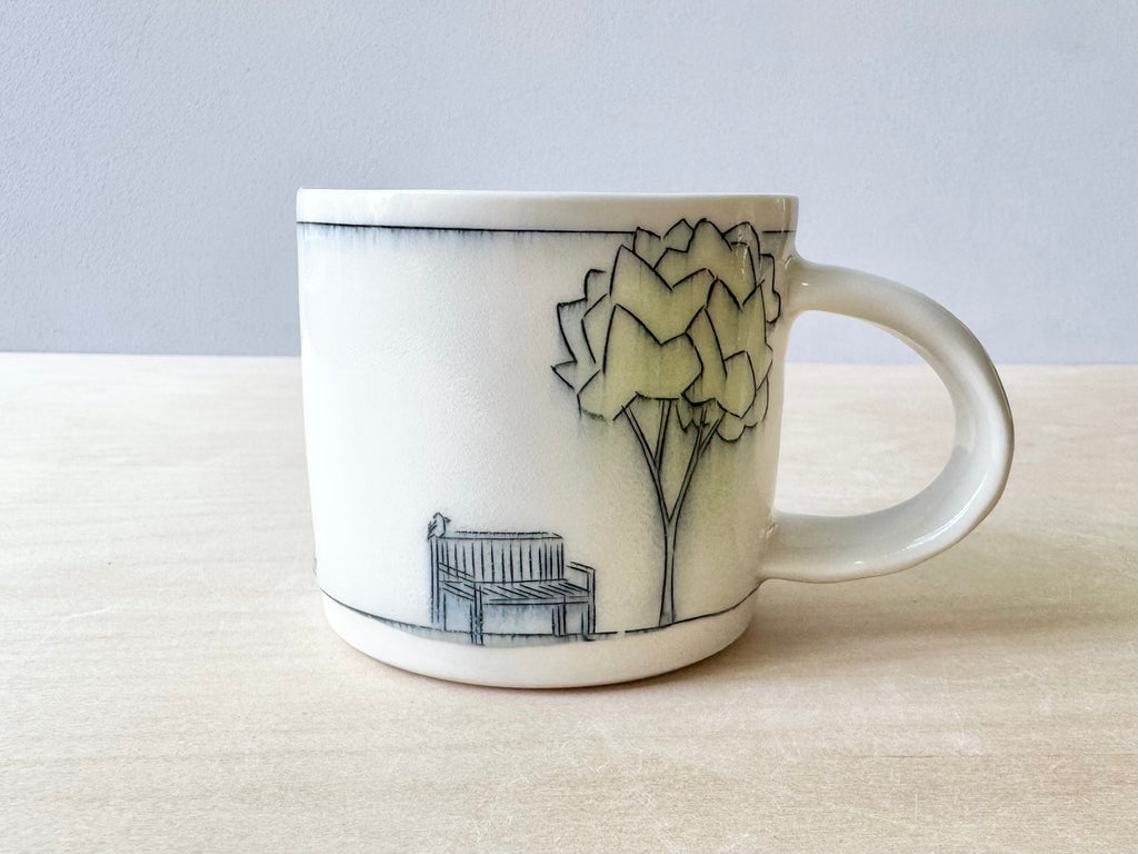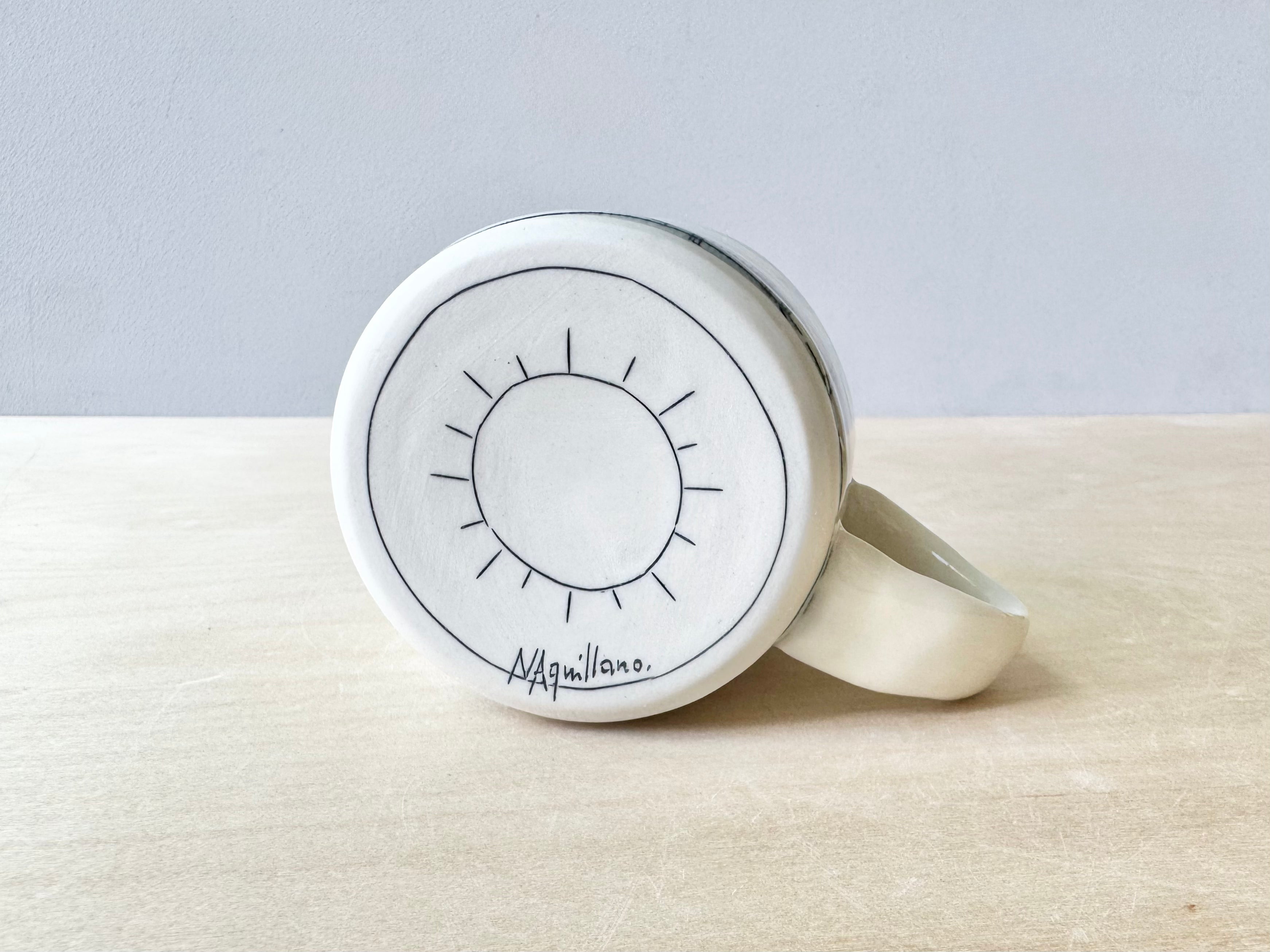 A one-of-a-kind mug inlaid with imagery. Ready-to-ship mug holds approximately 12 ounces and is microwave & dishwasher safe!