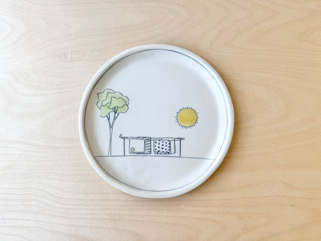 A one-of-a-kind dish inlaid with imagery. Ready-to-ship dish measures approximately 9 inches in diameter by 0.25 inches tall and is dishwasher safe!