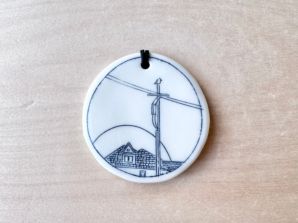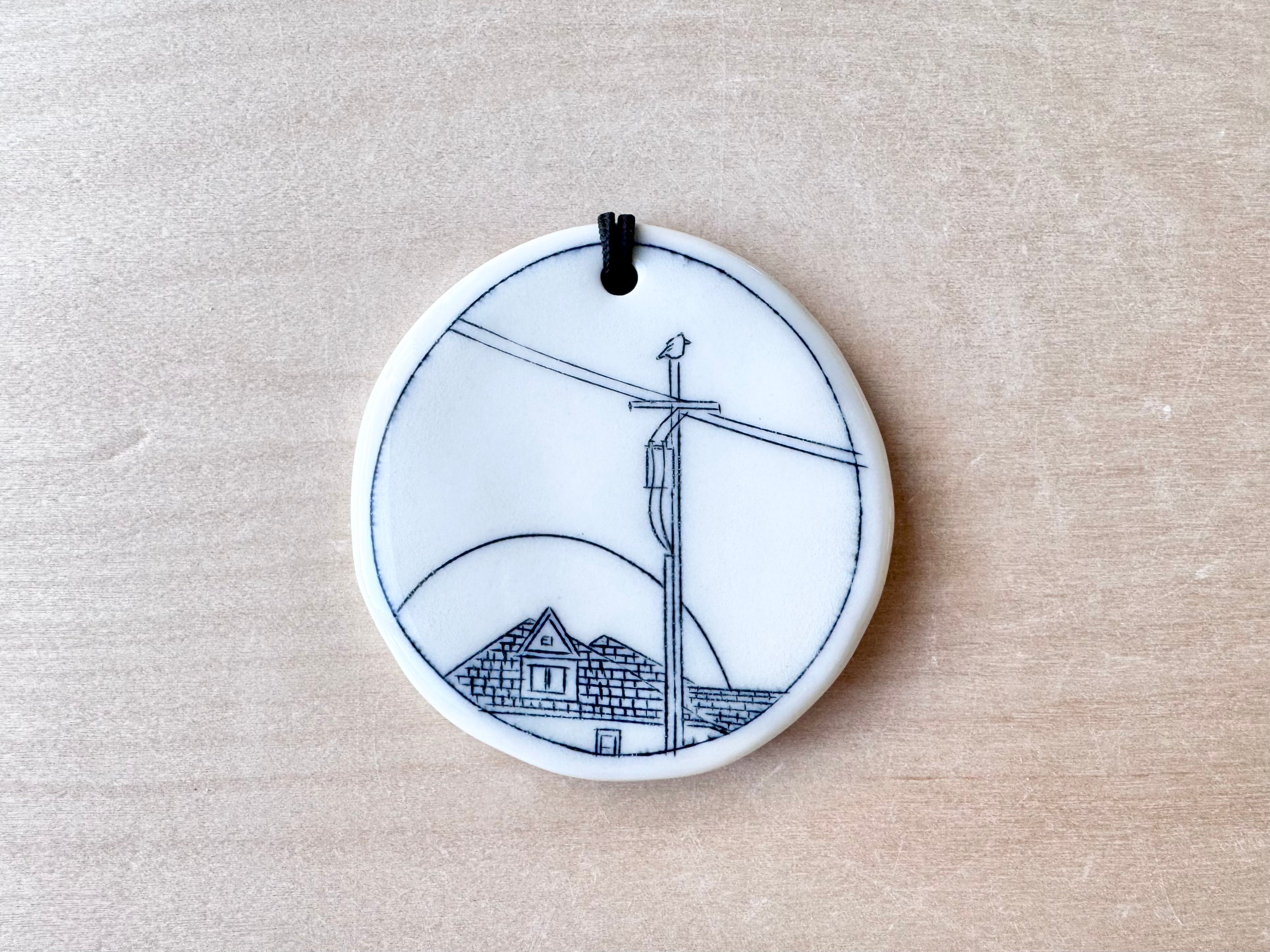 A one-of-a-kind ornament inlaid with imagery - this listing is for one ornament (bottom right). Ready-to-ship ornament measures approximately 3.5 inches in diameter!