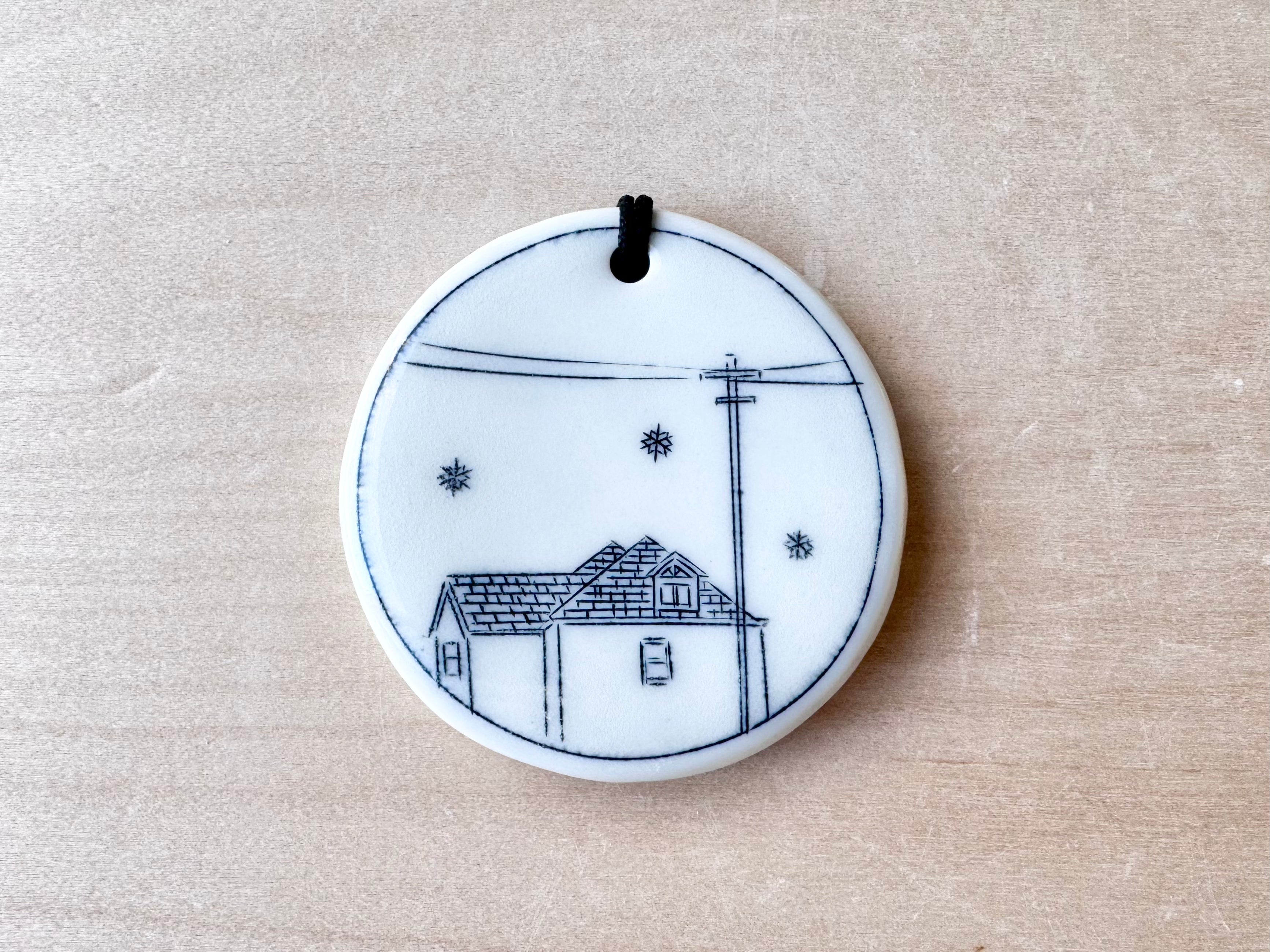 A one-of-a-kind ornament inlaid with imagery - this listing is for one ornament. Ready-to-ship ornament measures approximately 3.5 inches in diameter!