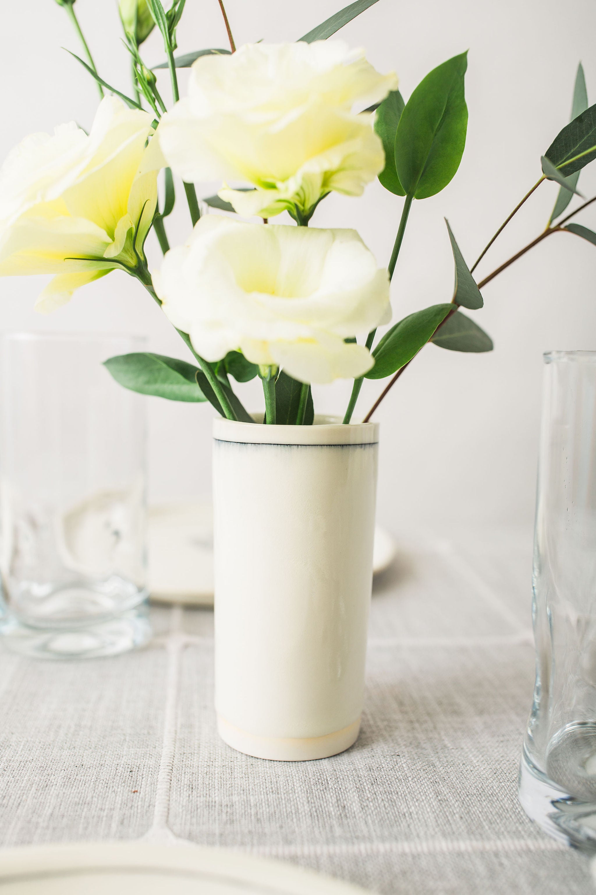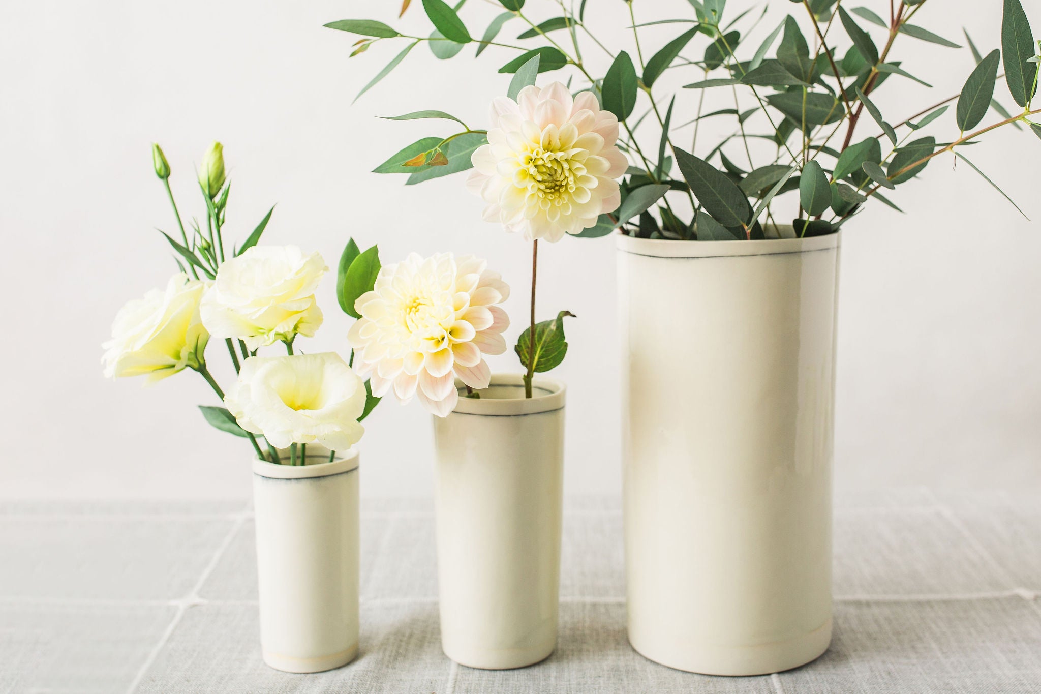 Perfect for use as a vase or vessel, or just on display, these everyday vases are just that - a shape for everyday. The bud vase measures approximately 2.25 inches in diameter x 5 inches tall. The tall vase measures 3.25 inches in diameter x 6.5 inches tall. The large vase measures 5.25 inches in diameter x 10 inches tall.