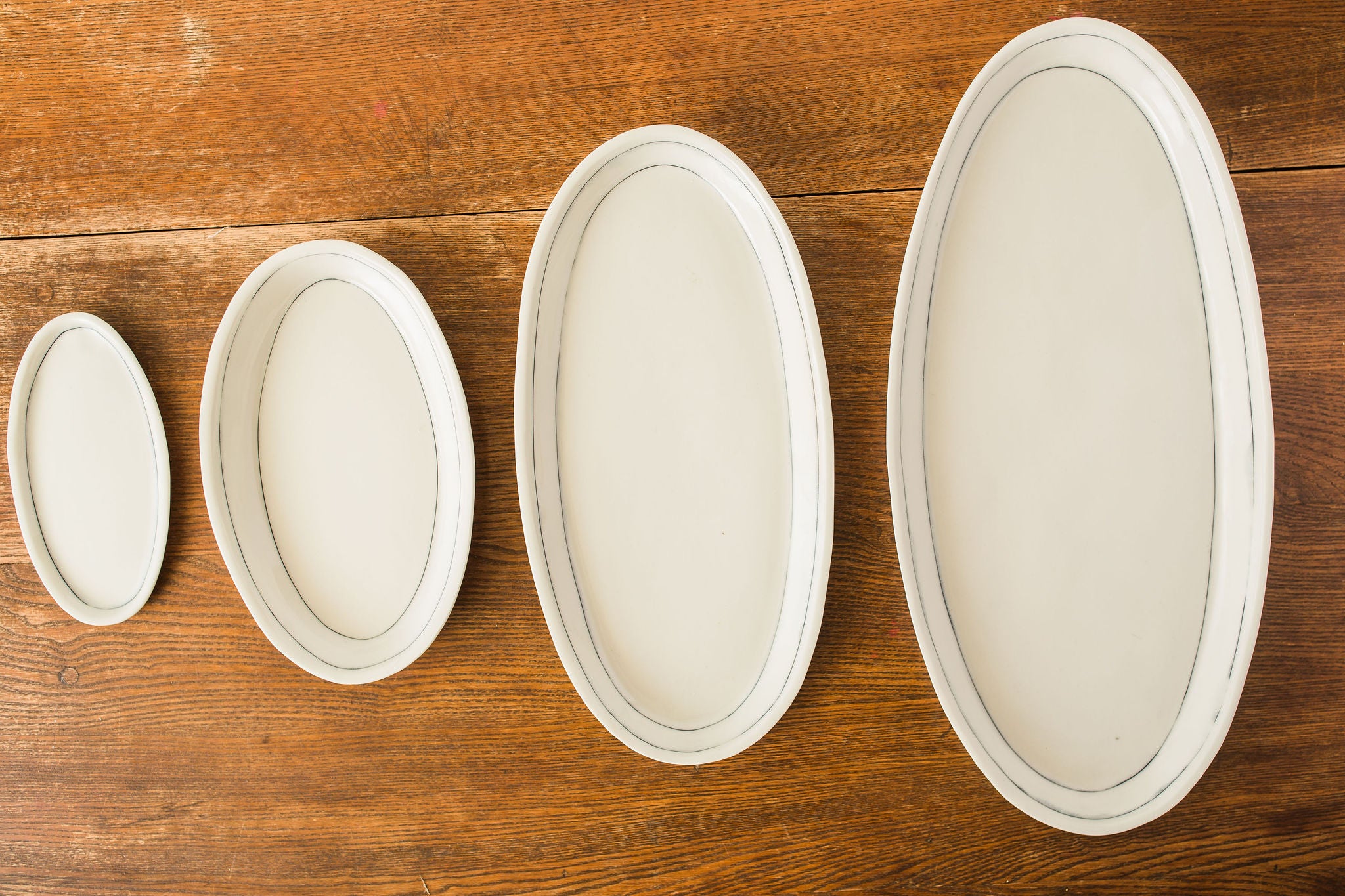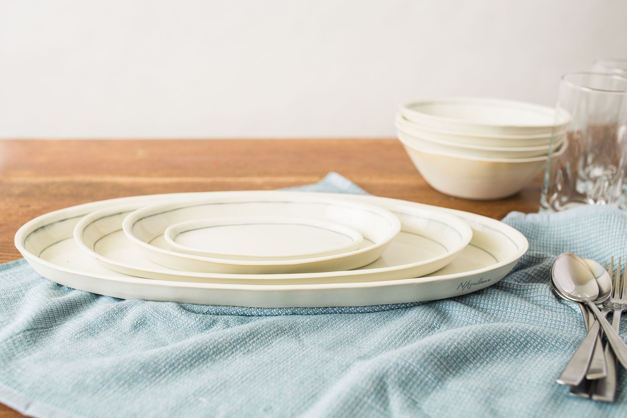 The ovals are an old favorite, since they are such incredibly versatile shapes. The small oval measures 6.75 x 3.5 x 0.5 inches and can be a butter plate, spoon rest, taco plate, the list goes on and on. The medium oval measures 9.5 x 5.5 x 1 inch and makes a great lunch plate or small serving dish. The large oval measures 13.75 x 6.5 x 1 inch and is a great compliment to any of the ovals or a perfect gift on its own. The extra large oval measures 17.5 x 8.25 x 1 inch and makes a great serving platter or centerpiece.