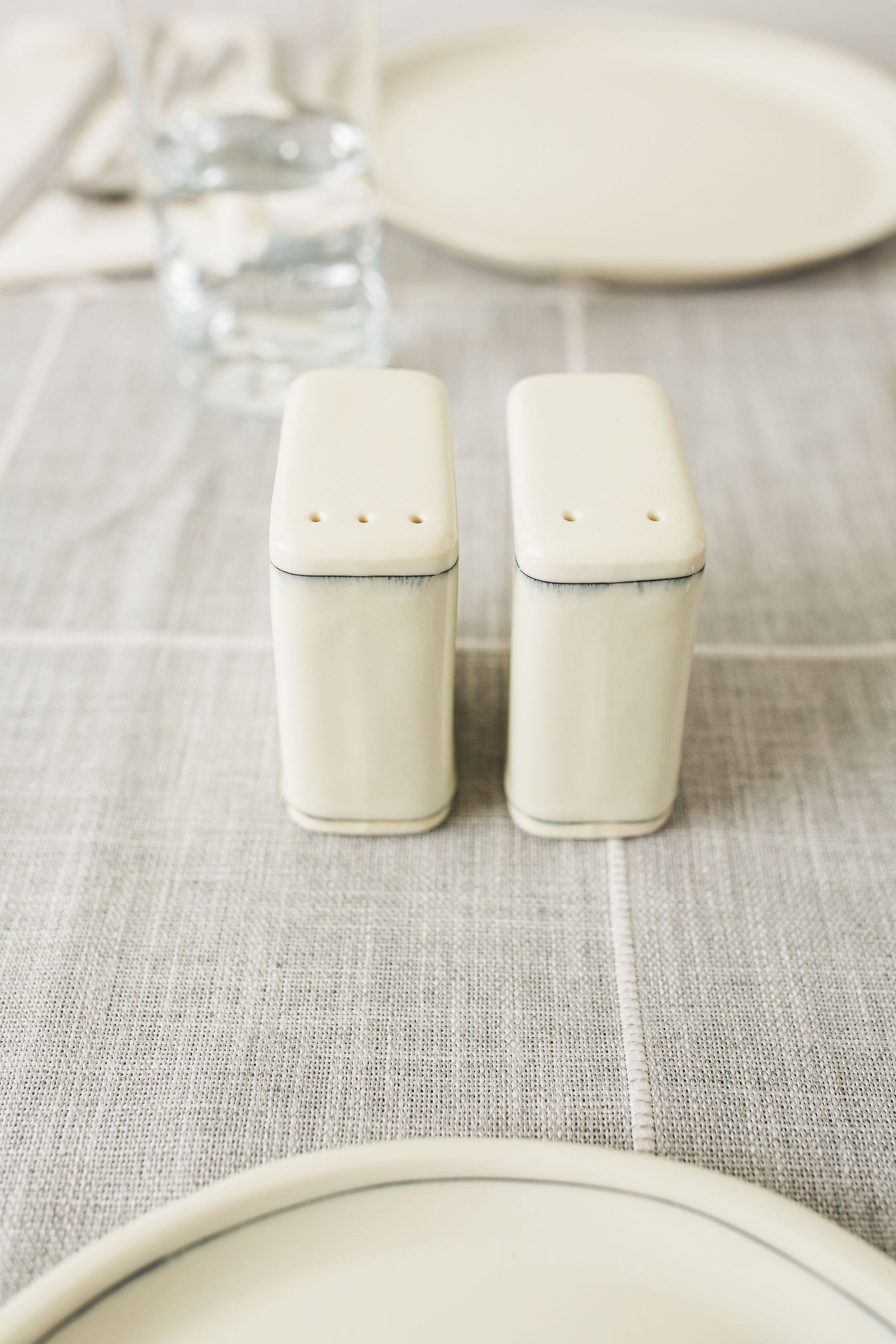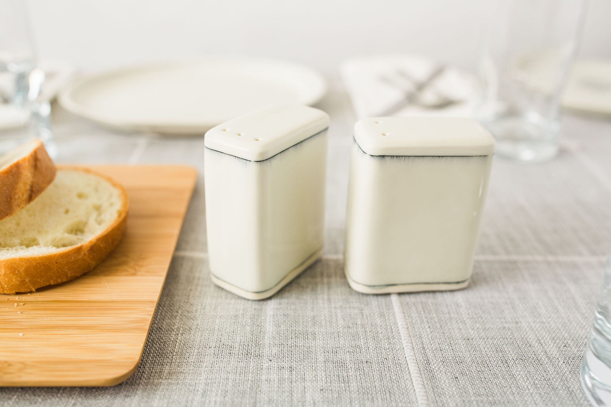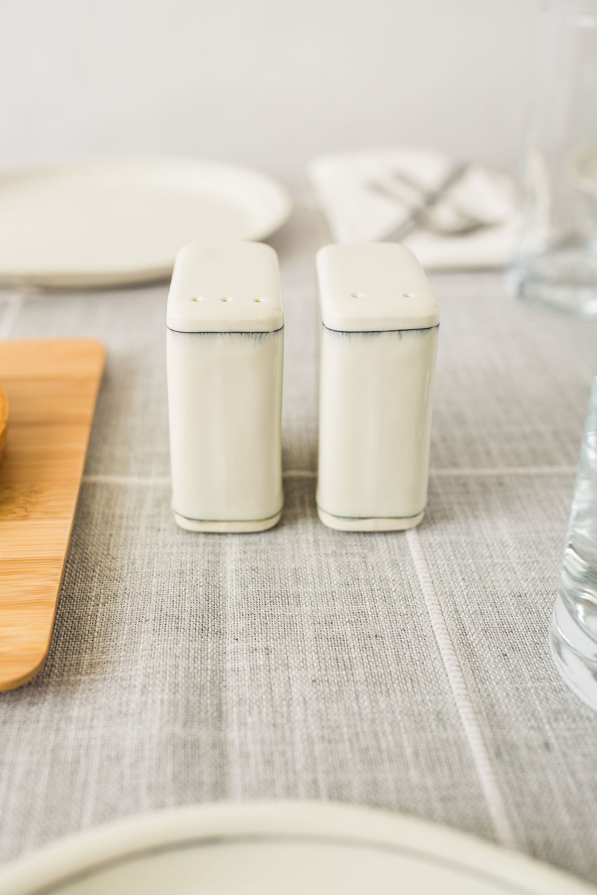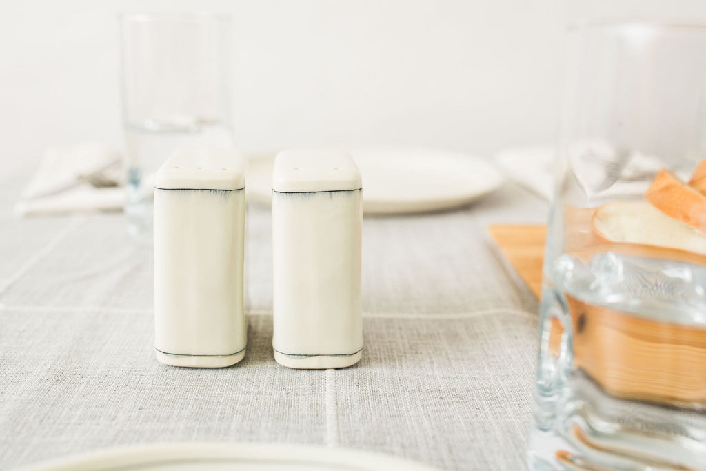 These rectangular salt and pepper shakers feel as good in your hand as they look set on your table. Each shaker measures 2.5 inches long x 1.5 inches wide x 3.5 inches tall.
