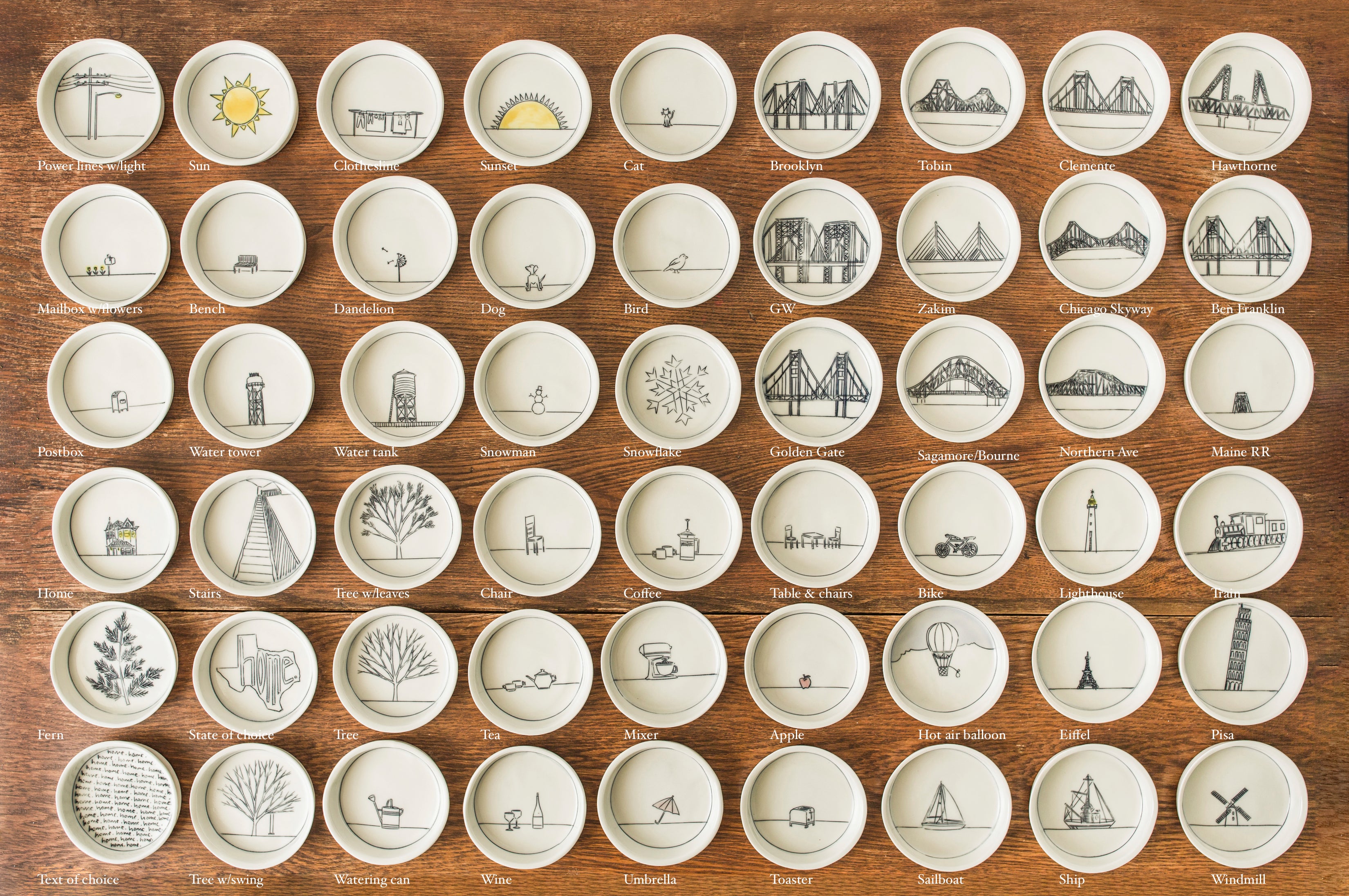 Each image is hand drawn directly into the porcelain clay with a knife, and the etching is inlaid with a dark underglaze. The high temperature of the kiln combined with a clear glaze overlay slightly blurs the drawing, much like a faded memory. Each piece is a one-of-a-kind work of art reminiscent of the places and experiences that define and connect us all.